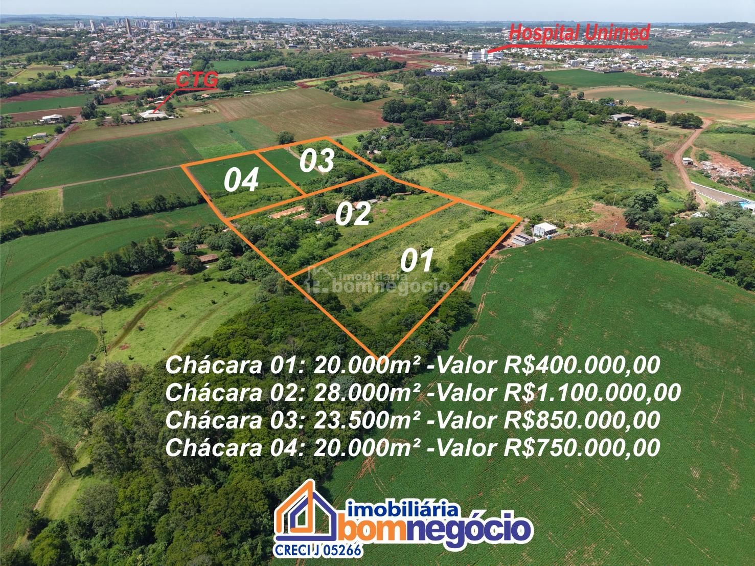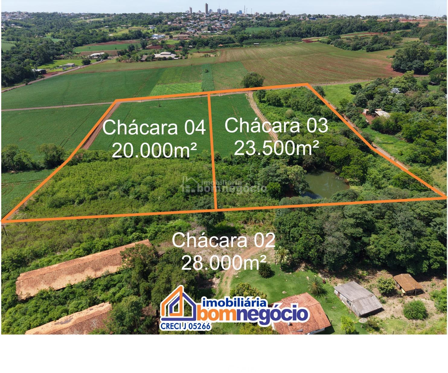 Imobiliária Bom Negócio vende com exclusividade Chácaras localizadas a apenas 500 metros do perímetro urbano de Marechal Cândido Rondon, unindo a tranquilidade do campo com a praticidade da cidade. Áreas disponíveis a partir de 20.000m², todas com escrituras individualizadas. Opções disponíveis: Chácara 01 20.000m² Valor: R$ 400.000,00 Chácara 02 28.000m² Valor: R$ 1.100.000,00 Benfeitorias: Casa em alvenaria para moradia, barracões, energia elétrica e água encanada. Chácara 03 23.500m² Valor: R$ 850.000,00 Destaques: Nascente de água e açude ideal para criação de peixes. Chácara 04 20.000m² Valor: R$ 750.000,00 --- ?? Agende uma visita com nossos corretores: 45 3254-7001 99921-9844 ?? Confira este e muitos outros imóveis em nosso site: www.imobiliariabomnegocio.com.br