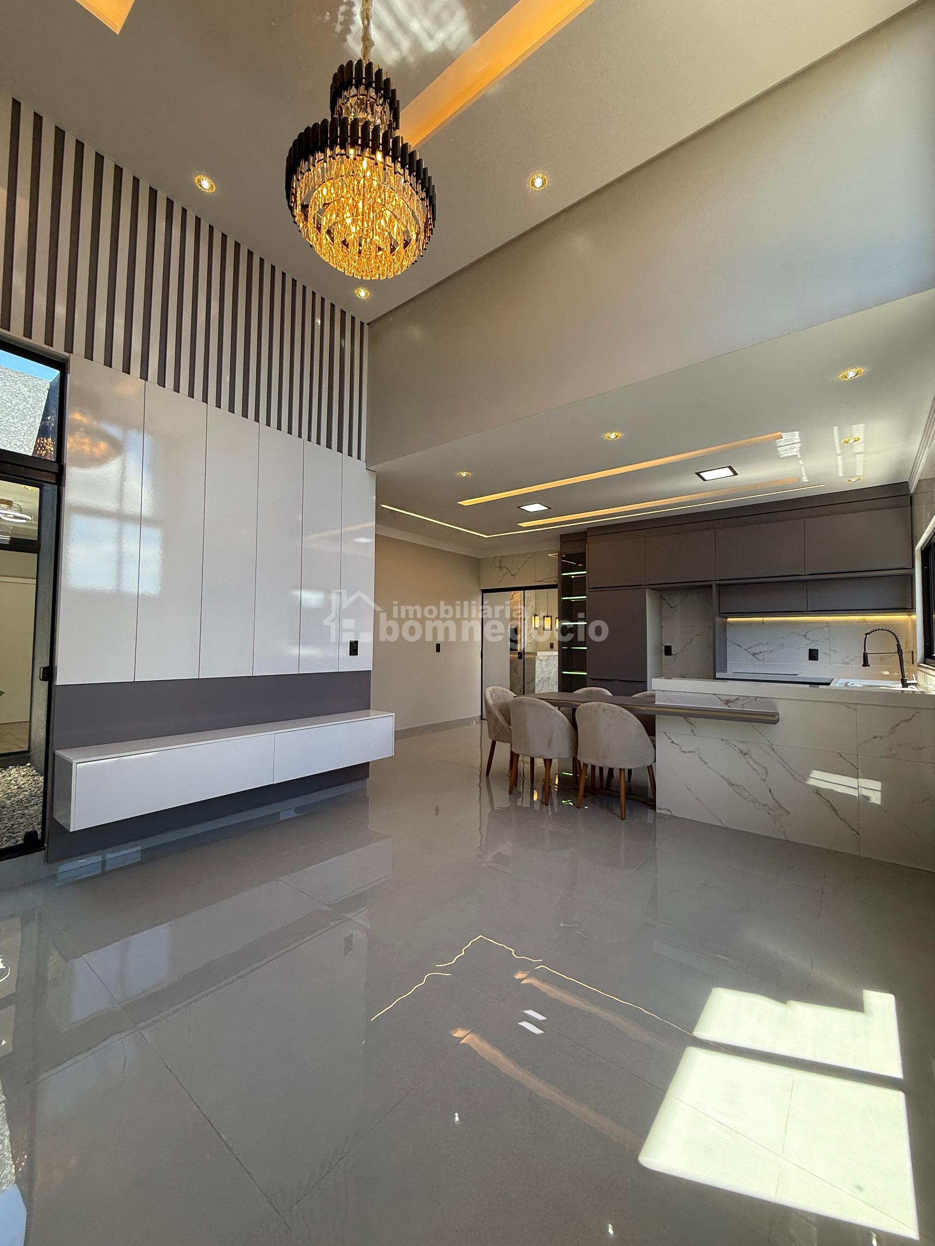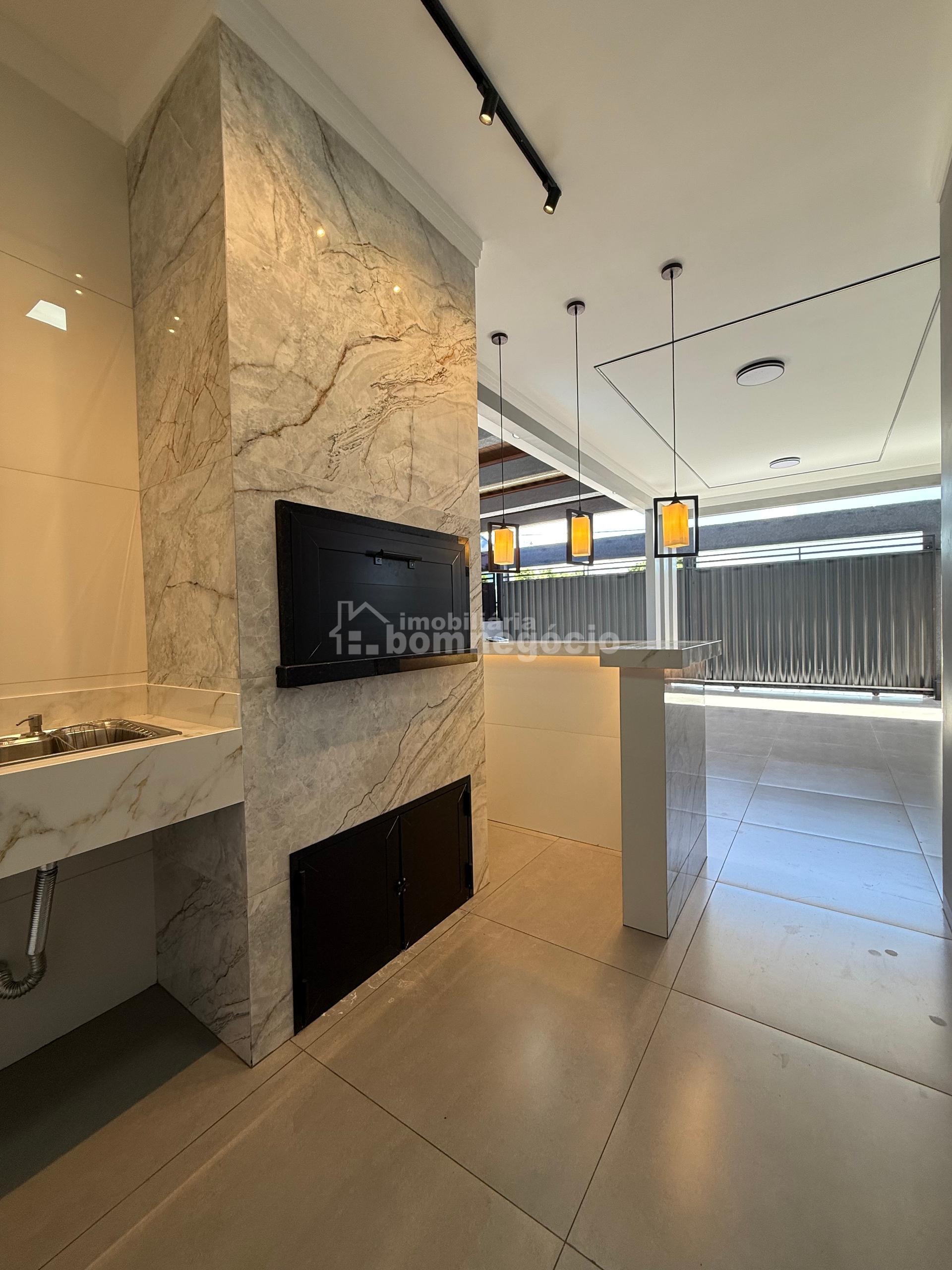 Sala com pé-direito alto Cozinha integrada Poço de luz Banheiro social Suíte master com closet Dois quartos Área gourmet Churrasqueira Banheiro externo Lavanderia fechada Passagem para os fundos Piscina Pergolado Excelente padrão de acabamento 145m² Construído